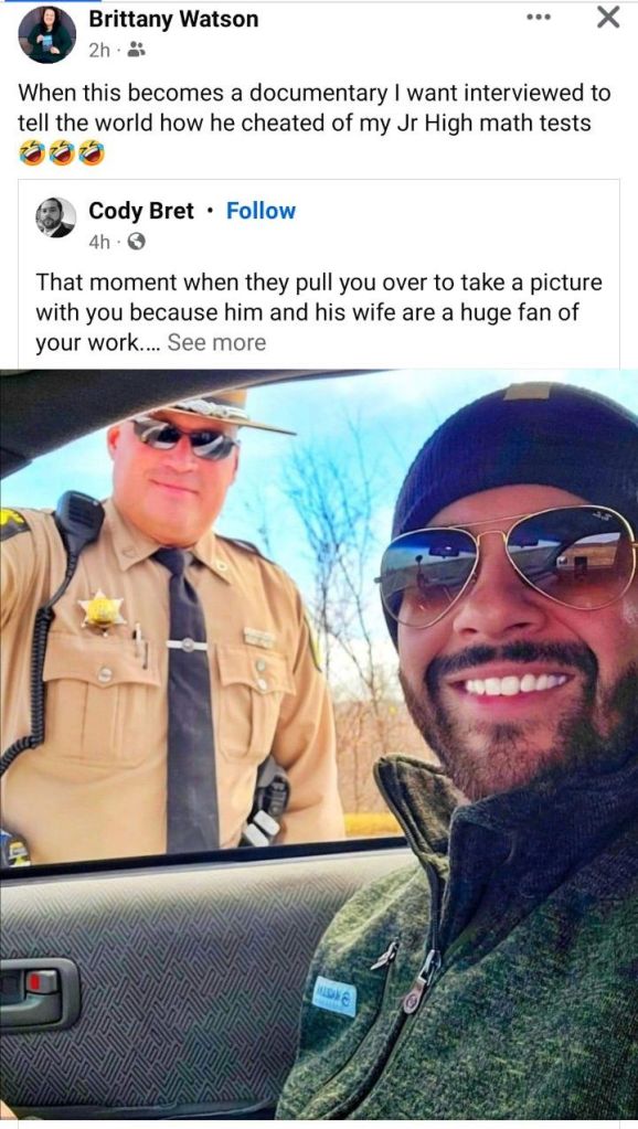 When in reality he was pulled over for speeding and asked HIM for a pic so Cody could fake another Facebook post. He’s such a fraud!